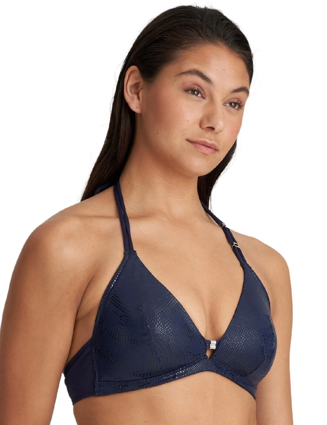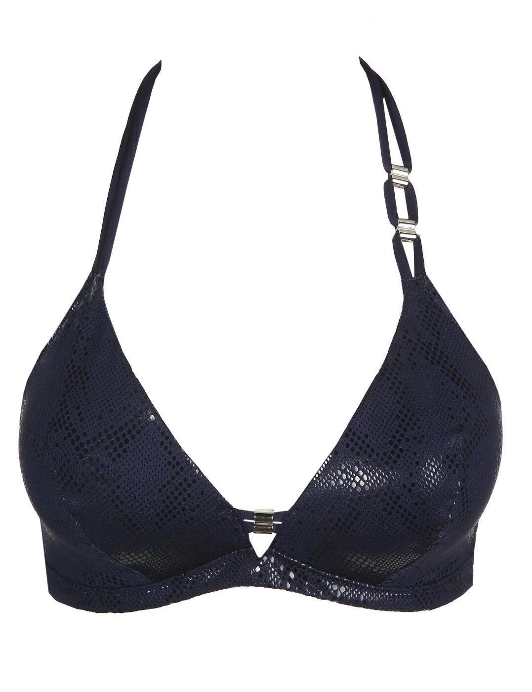 Introducing the Marie Jo San Domino padded triangle bikini top; perfect for women who seek an ultra-luxe look and feel while they lounge in the pool or beach. This swimwear is designed to flatter and enhance your bust like never before! It features triangle-shaped cups with a deep plunging neckline, along with lightly padded cups to further enhance your cleavage. Comfort is covered too, as the wireless design provides a comfortable fit all day long. The back clasp closure and double halterneck tie straps ensure this bikini top stays securely in place and provides a custom fit. The fabric of this high-end swimwear boasts an all-over eye-catching shimmery snakeskin effect, as well as elegant silver charms on one strap and in the centre for a luxurious touch.