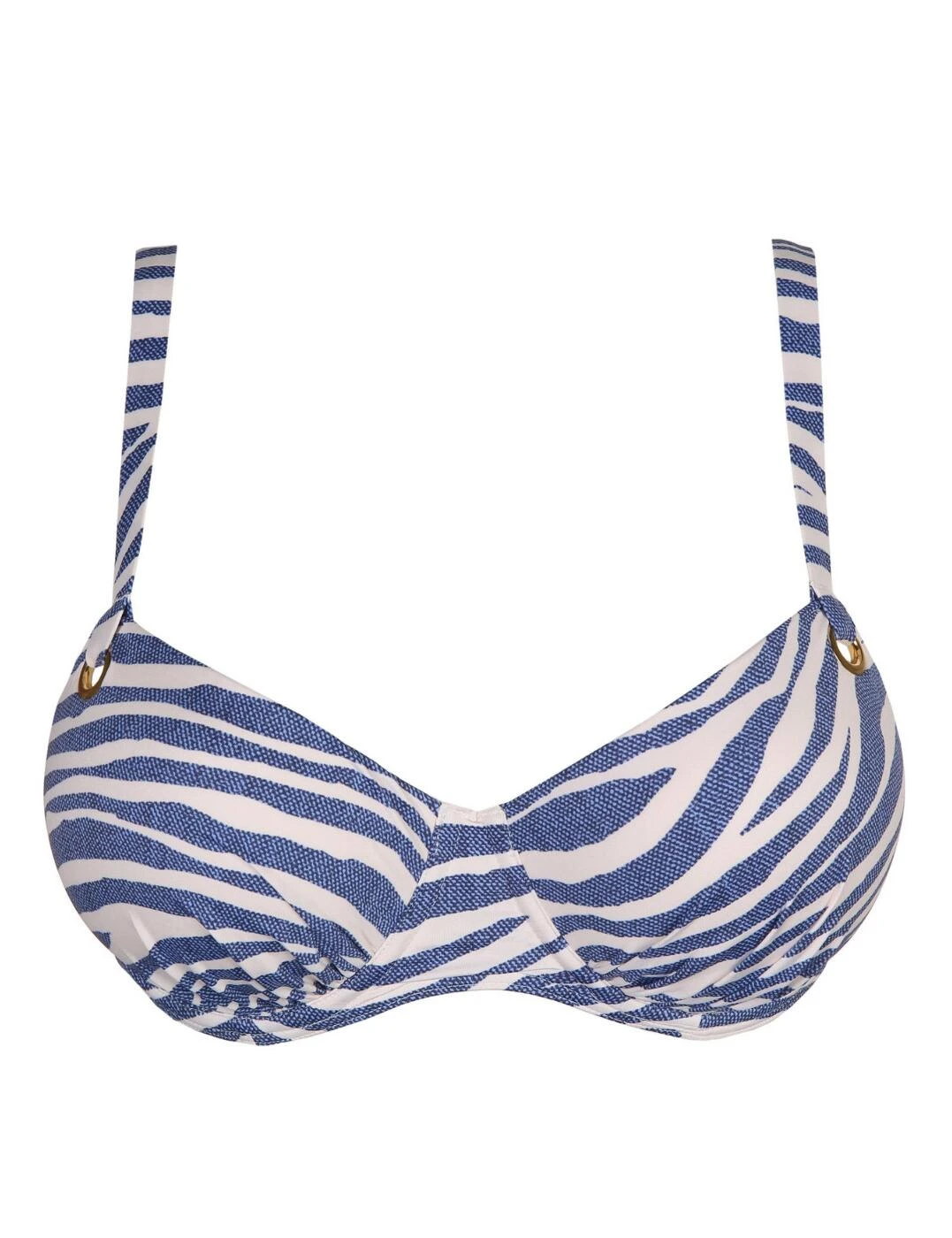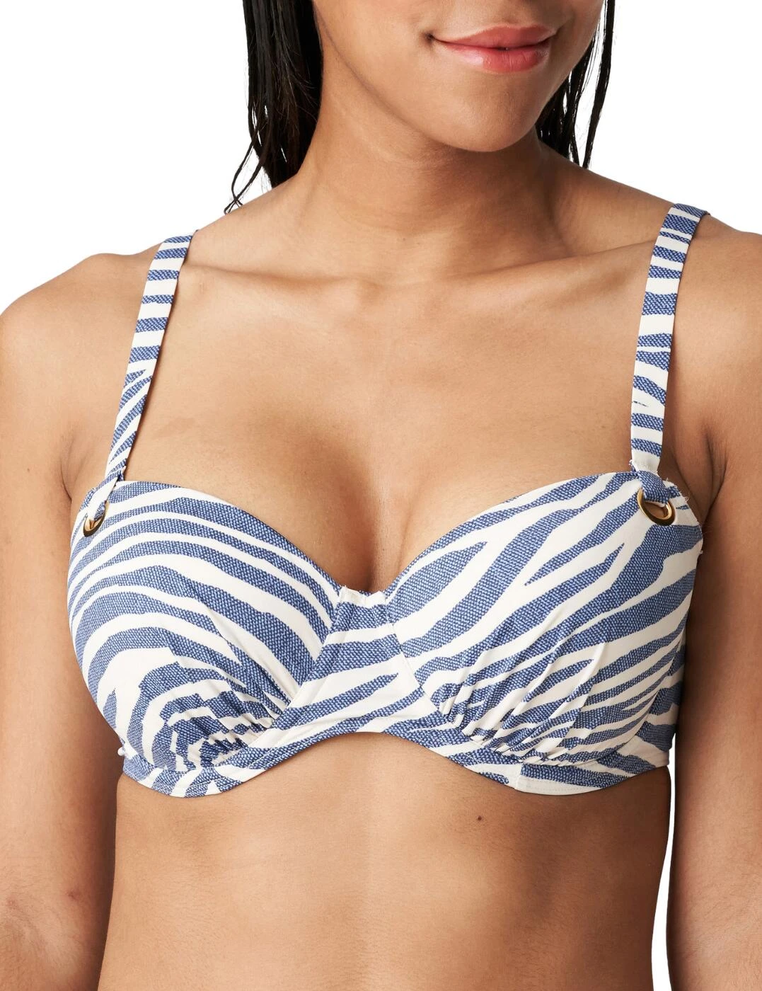 The Ravena range by Prima Donna Swim introduces swimwear with a trendy animal print in a denim look fabric. This bikini top has balcony-shaped padded cups which creates a sexy look that highlights your cleavage. The bikini is underwired for support. On the cups, there is a delicate ruching detailing with brass rings which the straps loop through. The adjustable straps allow for the option of a classic beach look with a halterneck choice. It fastens at the back with a clasp closure.