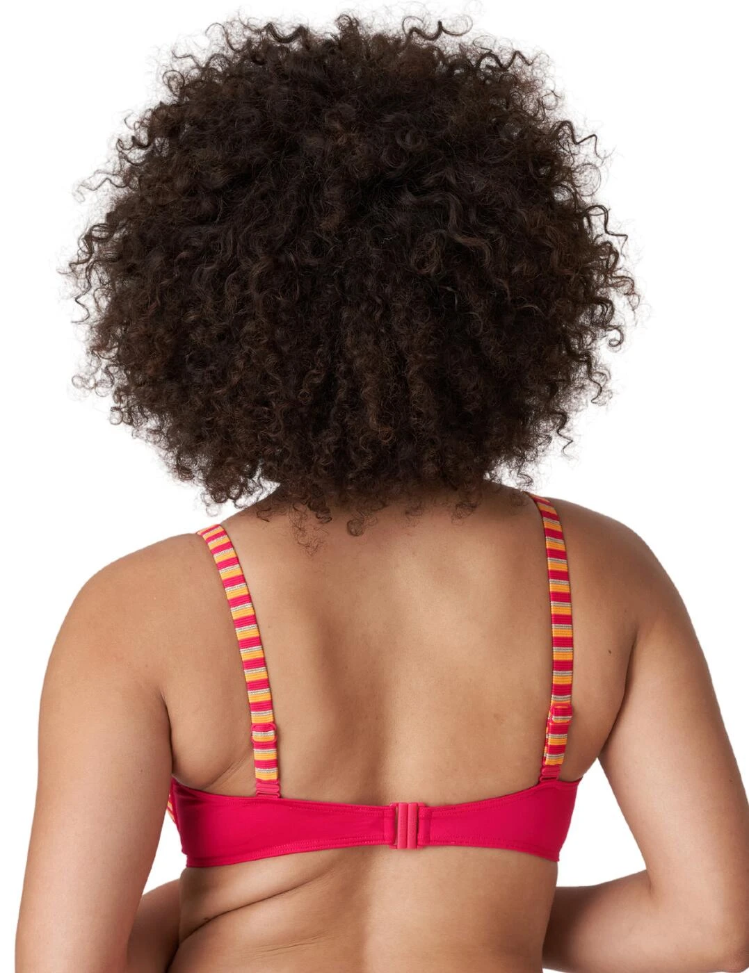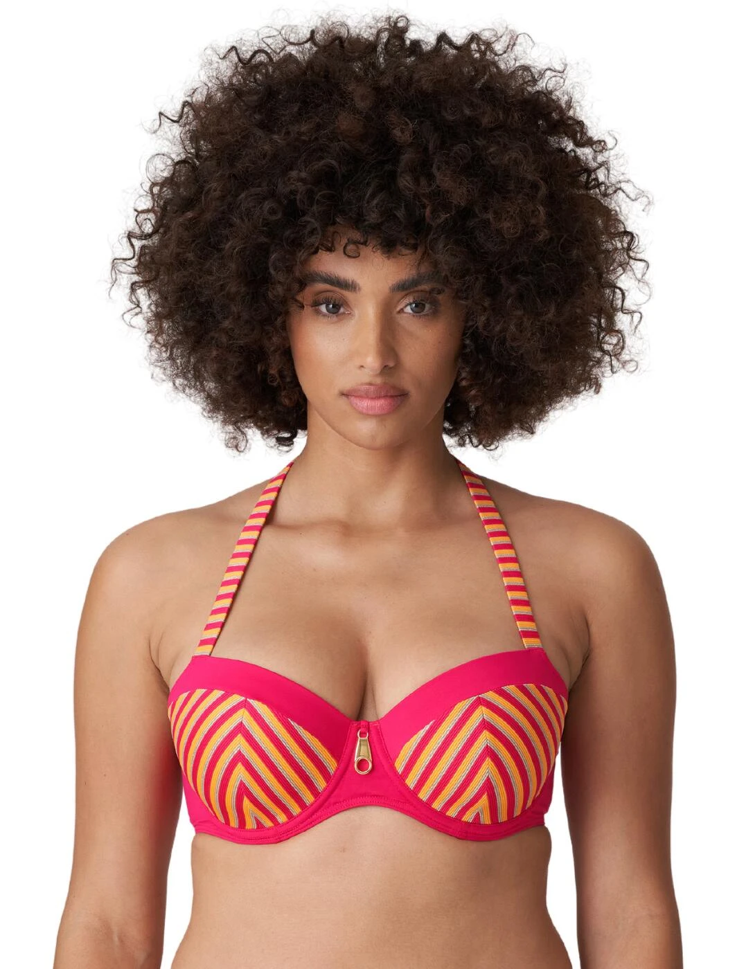 Stand out by the pool in this padded balcony bikini top from the La Concha range by Prima Donna Swim that brings luxurious swimwear with a retro feel. This bikini top has striped cups and striped straps whilst the outline of the cups and back band is crafted from a plain opaque fabric creating a bold look along with the eye-catching charm in the centre. It showcases your bust beautifully with medium coverage, padding, uplifting and supportive underwire and the sexy balcony shape. Achieve a comfortable and individual fit with the plastic clasp closure and adjustable straps that can be worn as a halterneck.