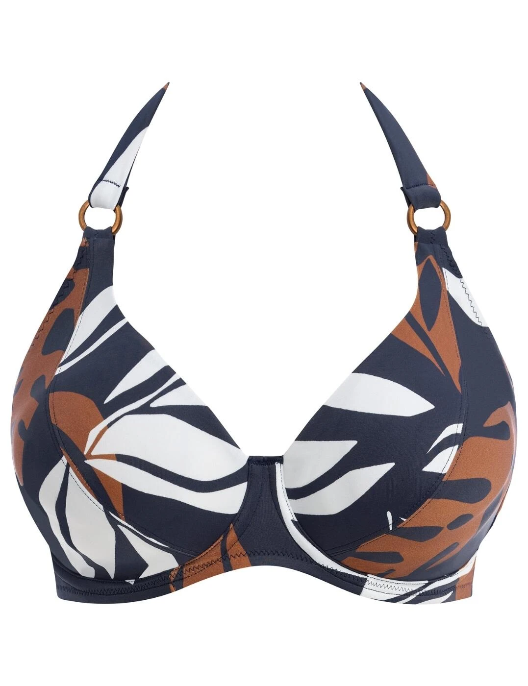 Welcome this season in style with this Fantasie Lake Orta halterneck bikini top. Boasting a chic abstract botanical print, this top is sure to make a statement during your next beach vacation. The halter-neck scarf tie and apex ring detailing will ensure you look elegant and stylish, while the plunging neckline adds an alluring edge. Moreover, this top features lined, underwired cups for a supportive and comfortable fit with each wear. The powernet-lined wings add support and anchorage to your curves for an elevated look. Fasten this piece at the rear with a classic back clasp closure for security and complete the look with matching coordinates available from Fantasie’s Lake Orta collection.