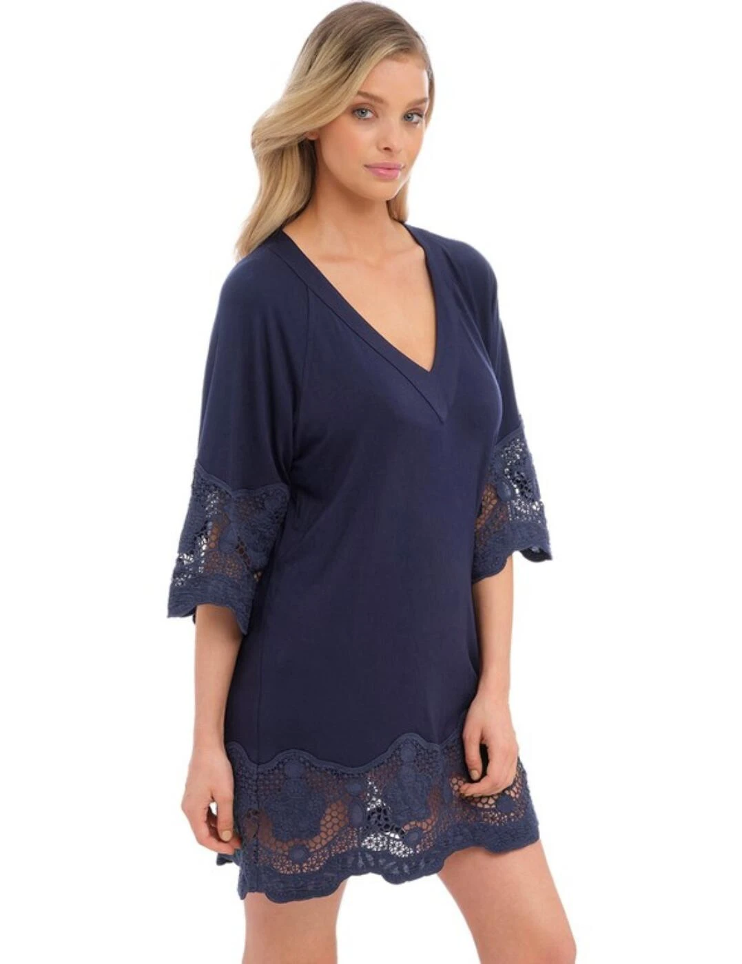 Introducing the Fantasie Dione tunic – a luxurious swim cover-up that’s perfect for any occasion. With this easy throw-on piece, you don’t have to waste time trying to figure out what to put on! Just pull it on, and you’re ready to go. The soft lightweight fabric ensures maximum comfort and is designed with a deep v-neckline and 3/4 sleeves for the most flattering look. It also sits at mid-thigh length for coverage without sacrificing style. Its guipure embroidery edging adds a touch of feminine elegance so you can stand out from the crowd. So when you want to take your swimwear look up a notch, pair it with Fantasie’s swimwear and get ready to make an unforgettable statement!