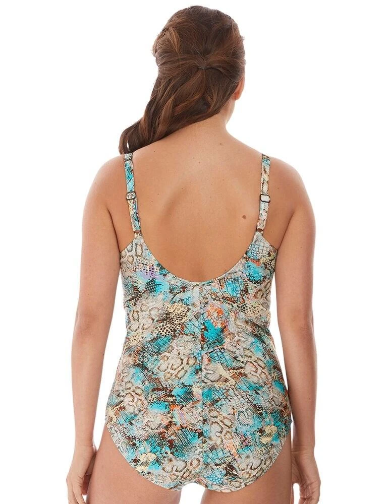 Immerse yourself in soft aquatic tones and a beguiling animal print with this standout Manila swimsuit from Fantasie. Features a deep plunge neckline together with gentle underbust gathers for shaping, and light control smoothing lining to flatter the tummy area. Concealed underwire, Powernet fabric-lined wing, and adjustable shoulder straps support the bust.