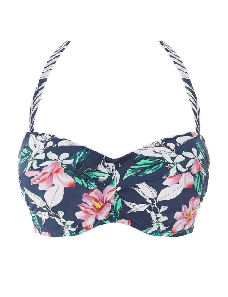 Get beach-ready with this bold floral bikini top from Fantasie’s Port Maria collection. This bikini top is a unique bandeau meets bra with the flattering twist bandeau style appearance at the front and a clasp at the rear for easy closure. In a versatile style, this bandeau can be worn on its own or with a detachable scarf tie in a contrasting print, giving you the opportunity to mix it up whenever you wish. The cups have been designed with light padding for smoothness and a great shape. Feel great support with concealed underwire and lined wings. Pair this bikini top with a matching pair of briefs!