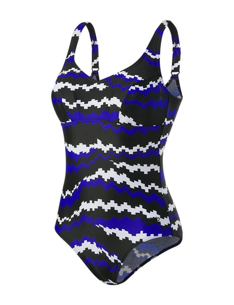 This feminine swimsuit is from the Marlena range by Speedo. Designed with wide adjustable straps and a U back design. A beautifully feminine neckline is created thanks to the gathered detail at the bust. Low legs provide extra coverage. Created in chlorine resistant fabric with a concealed tummy panel to smooth over the figure beautifully. Removable padded cups to enhance your shape. An inner mesh panel holds and flatters your figure. This swimsuit fits like new for longer. Sun protection; UPF 50+.