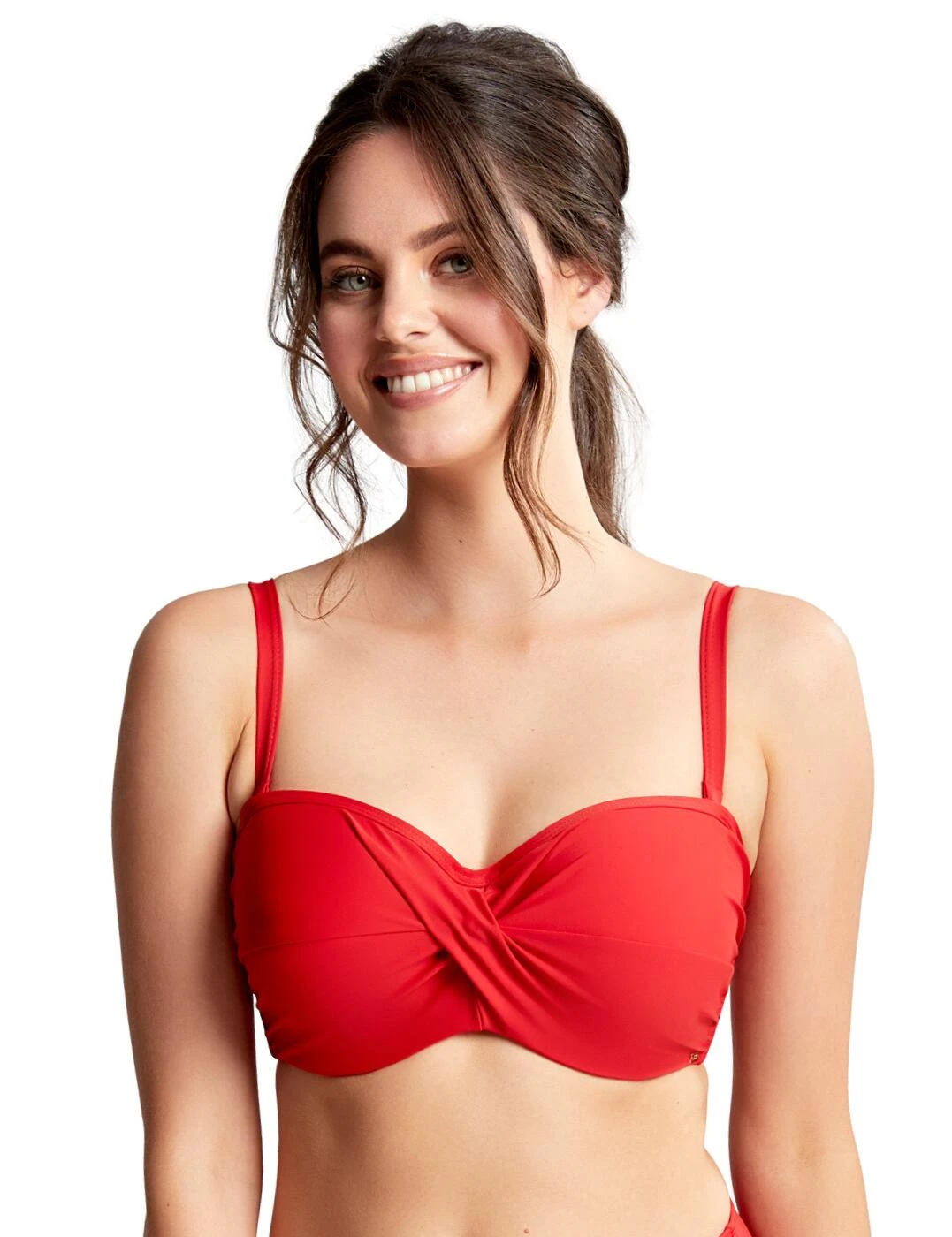 Feel sexy and confident poolside in the bold Anya Riva collection by Panache. This adaptable twist bandeau bikini top can be worn either with shoulder straps for a timeless look or without for a flirty minimal style. The twist detail and heart-shaped neckline highlight your alluring cleavage whilst remaining an elegant sophisticated look. Underwiring offers support and foam cups from sizes D+ provide added support. For a sexy coordinated look, wear with matching swimwear from the Anya Riva collection by Panache.