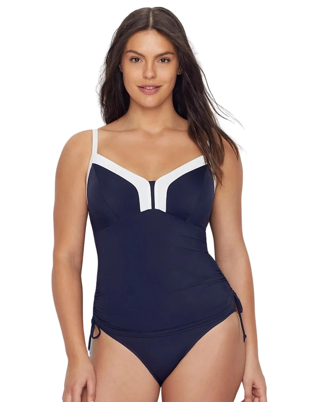Feel chic by the pool with Panache’s Catarina tankini top. The contrasting neckline and straps add a bold touch, accentuating your bust and decolletage. The cups are underwired and non-padded for a supportive, natural look that is comfortable and flattering. The concealed hook and eye fastening at the rear allows you to get a secure fit and the straps are adjustable to fit perfectly to your size. This tankini top features drawstring features on the sides to shorten the length and add a charming ruched effect.