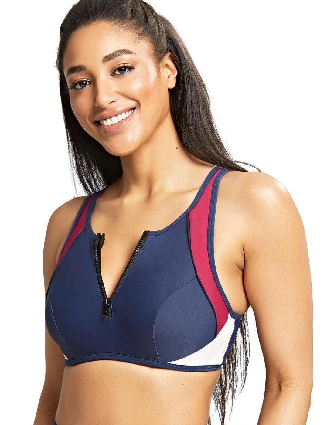 A stylish yet sporty look for your next getaway. The on-trend style of the crop top offers a nearly full-zip frontal closure which allows optimal personalisation of exposure. Small white segments located under the bust give the illusion of accentuating your bust whilst slimming the waist. Adjustable straps with two different closures at the rear offer an adaptable fit whilst still ensuring a secure fit.